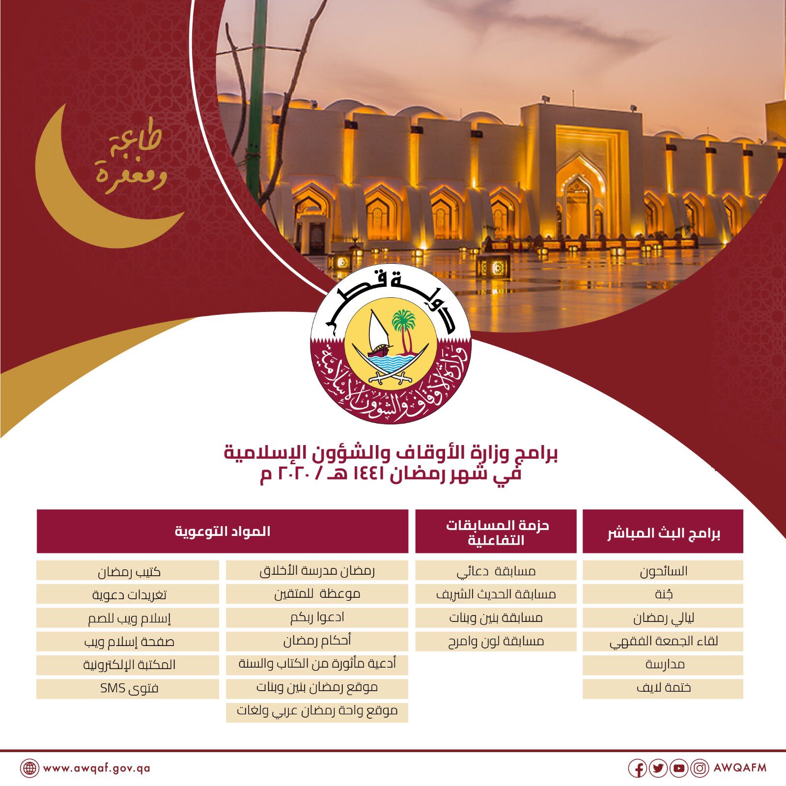 وزارة الأوقاف قطر Sur Twitter برامج وزارة الأوقاف والشؤون الإسلامية في شهر رمضان المبارك 1441هـ 2020 م لأجل قطر كلنا في البيت سلامتك هي سلامتي طاعة ومغفرة Https T Co Ybrtnjg2q9
