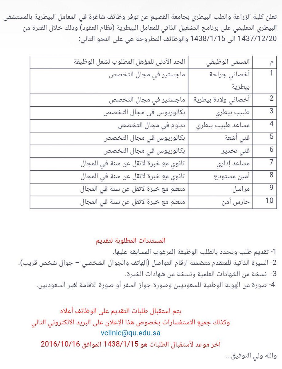 مهند وظائف القصيم على تويتر وظائف رجالية لازال التقديم متاح بالمعامل البيطريه التابع لكلية الزراعه والطب البيطري بجامعة القصيم خلال الفترة من 1437 12 20 الى 1438 1 15 Https T Co Vogrdugvq7