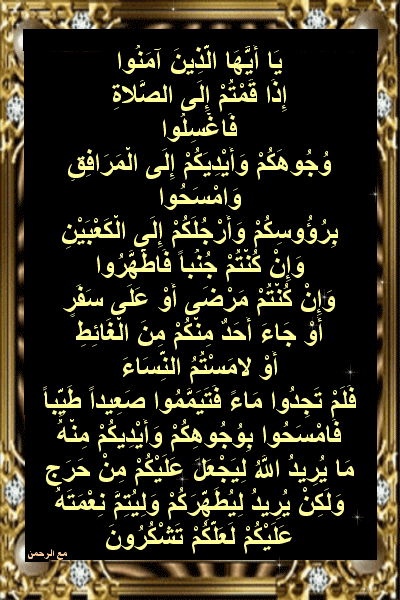 013585 يا أيها الذين آمنوا إذا قمتم إلى الصلاة فاغسلوا وجوهكم وأيديكم إلى المرافق وامسحوا برءوسكم وأرجلكم إلى الكعبين وإن كنتم جنبا فاطهروا وإن كنتم مرضى أو على سفر أو جاء